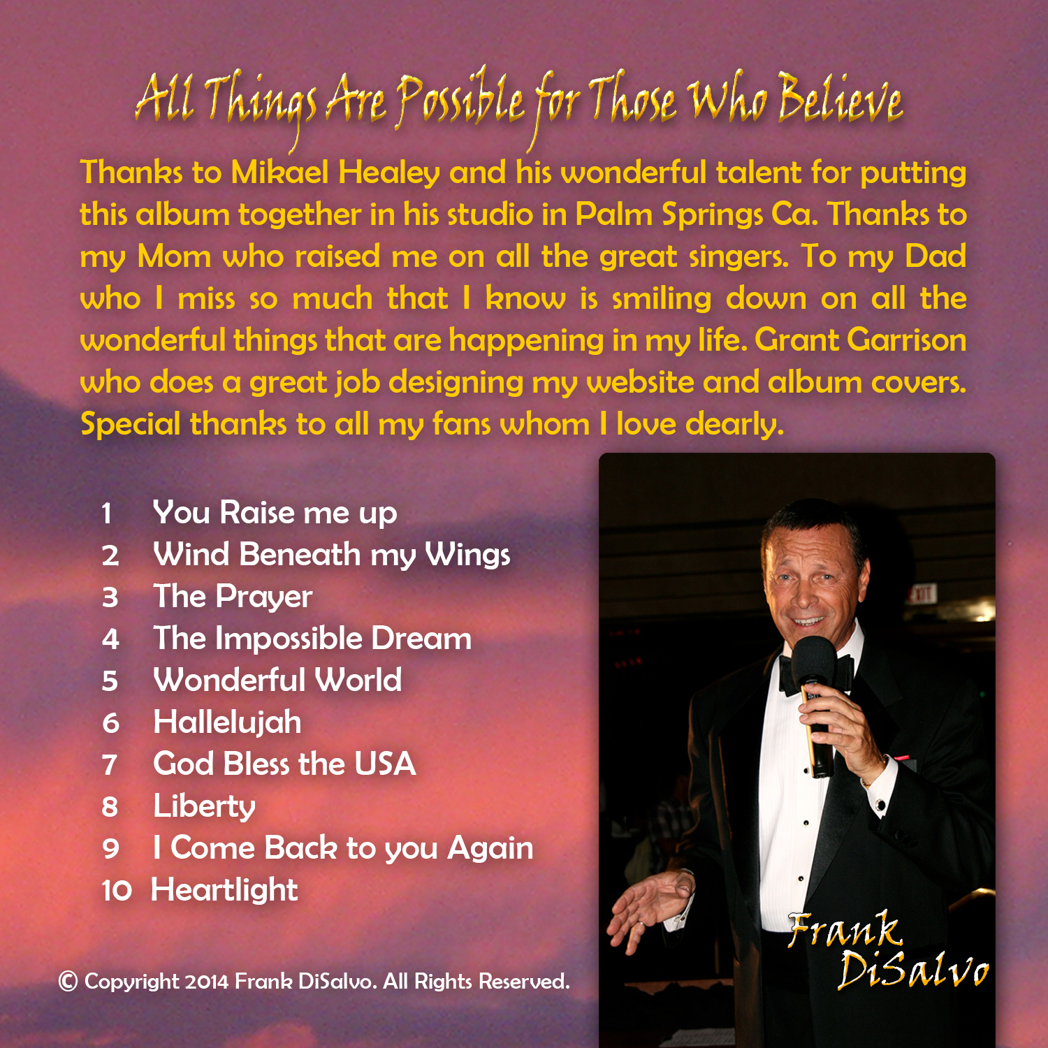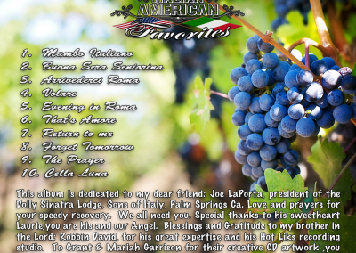 A true entertainer, Frank has performed all over the country and abroad for over 45 years. Frank brings to you an exciting and compelling show filled with memories and laughs that you’ll be talking about for a long time. He has mastered the phrasing and styling of the “Chairman of the Board” and you’ll be moved by his wonderful voice that has blessed thousands. Franks shows are filled with top hits, laughs and always the highest quality and class. It will bring you back to the wonderful era of music that immortalized great singers: Bobby Darin, Nat King Cole, Tony Bennett, Dean Martin, and the great singers from the Great American Songbook.